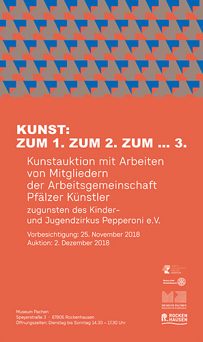 Mit "Kunst: Zum 1. zum 2. zum ... 3." bieten die APK und der Rotary Club Rockenhausen in Kooperation mit der Stadt Rockenhausen zum ersten Mal eine Auktion an, bei der Kunst für einen gemeinnützigen Zweck versteigert wird. Zahlreiche Künstler haben ihre Arbeiten lediglich für ein kleines Grundhonorar zur Verfügung gestellt, der Erlös der Auktion geht an das pädagogisch orientierte Förderprogramm für Jugendliche des Zirkus Peperoni e.V. Rockenhausen. Eine tolle Gelegenheit, sich sozial zu engagieren und gleichzeitig Werke Pfälzer Künstler zu erwerben.