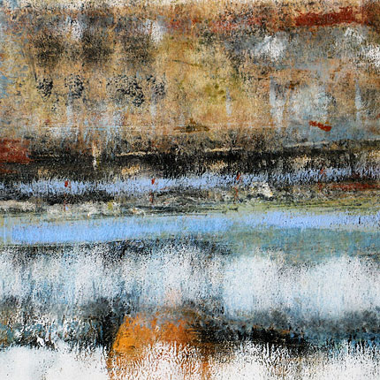 "Das Unterwegssein spiegelt sich auch im langen Prozess der Malerei, im Weg zum Bild und zur Farbe. Aus der Erinnerung heraus, frei und intuitiv werden Landschaftserlebnisse im Atelier umgesetzt und transformiert. Vieles wird verworfen, übermalt und wieder neu angefangen, wobei Brüche durchaus spürbar bleiben. Unter der oft pastos gemalten Oberfläche zeichnen sich tiefe Schichten ab und zeugen von der Metamorphose des Bildes.