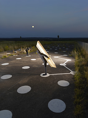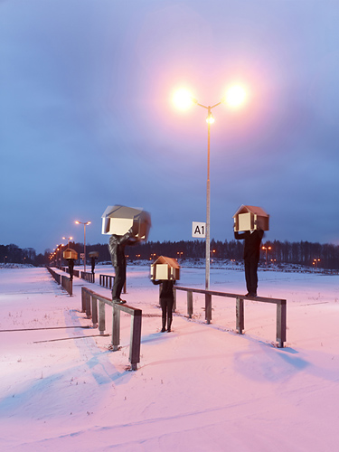Letzteres ist das, was übrigbleibt. Insofern ist trotz aufwändiger Arrangements vor der Kamera das fotografische Bild die Quintessenz wie ein gedehnter "entscheidender Augenblick". Nur scheint die Wahl dieses Augenblicks willkürlicher zu sein, da ein Vorher und Nachher nicht zwingend aus dem ausgewählten Bild hervorgeht. Wenn im Theater der Vorhang geöffnet wird, registrieren wir als Zuschauer sofort den Bruch zu unserem Alltag. Ähnlich versucht Thomas Brenner seinen Inszenierungen den Hinweis zu geben: Achtung, dies ist eine Inszenierung!