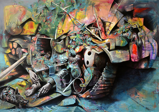 "Gestrandeter Wal" zum Beispiel. Das Bild zeigt einen von links diagonal ins Bild geführten, auf die Seite gekippten Schiffsrumpf mit einem großen Zahn- oder Schaufelrad an der Vorderseite. Die Container auf dem Schiffsdeck stürzen um. Im Vordergrund rechts hat sich ein Kind mit Schwimmflügeln auf eine im Wasser schwimmende Boje gerettet. Der Bildtitel interpretiert die düstere, surreal anmutende Katastrophenszene als einen gestrandeten Walfisch - ein typisches Moment in Benjamin Burkards Bildwelten, in denen Maschinen oder Maschinenteile häufig die Gestalt tierischer oder menschlicher Wesen annehmen, technische und biomorphe Bildelemente verschmelzen. Typisch ist auch die Art und Weise, wie die Bildidee entstand: Burkards Bildern liegen nämlich häufig alltägliche Beobachtungen zugrunde, in diesem Fall am Containerterminal im Hafen von Wörth am Rhein. Diese visuellen Eindrücke werden in einer Art gemalter Collage mit Motiven kombiniert, die der Künstler aus einem riesigen Bilderfundus schöpft, den er im Laufe der Jahre zusammengetragen hat und der beständig wächst; sei es durch eigene Fotografien, sei es durch Bilder aus dem Internet. Auch solche Fotos können den Anstoß zu einer Bildfindung liefern, so geschehen bei "Das Nest". Burkard hatte eine Aufnahme des Flugtagunglücks von Ramstein vom 28.08.1988 gesehen und spontan die Idee entwickelt, in einem Bild Trümmerteile eines Flugzeugs mit tierischen Flugwesen zu verbinden: Vögeln. Auf dem Boden liegende Triebwerke dienen den Wellensittichen als künstliche Bruthöhlen. Fliegen von Maschinen, Fliegen von Tieren - es sind solche Parallelen und Analogien, die den Künstler faszinieren, bis hin zu Wortspielen in Bildtiteln ("Viehzeugträger"). Sein Interesse für und das Verständnis von Prozessen in der Natur wurden durch das Studienfach Biologie (neben dem Fach Kunst und Kunstgeschichte) gefördert.