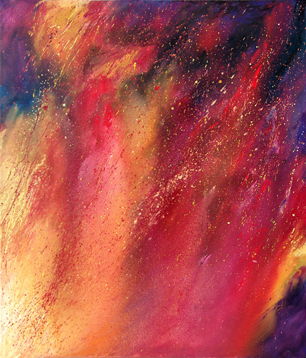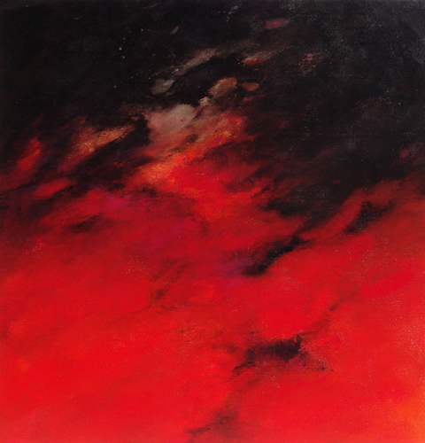 Durch vielschichtige Übermalungen verschiedenen Phasen des Farbwandels von brennendem Rot-Orange bis hin zu tiefstem, Lava artigem Schwarz, das Absterben, Entschwinden, allmähliche Erlöschen des Lichts und das Zunehmen der Dunkelheit wird in diesen kosmischen Bildern zum Ereignis.