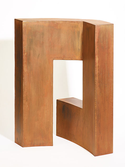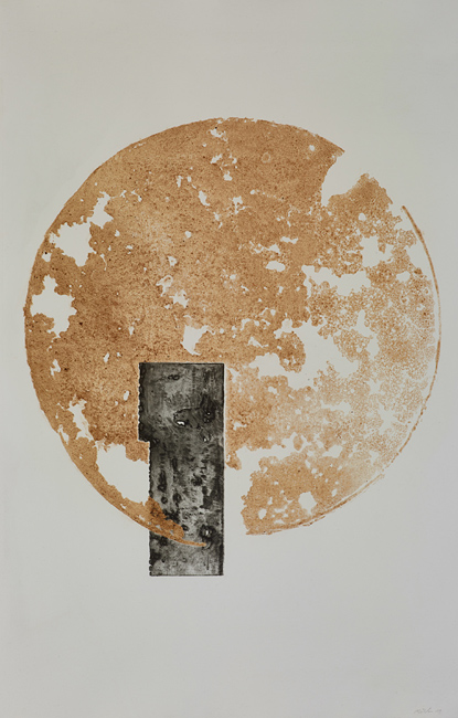Die auf Büttenpapier gedruckten Stahlplatten mit ihren Strukturen der Bearbeitung (Schweißnähte und Brennspuren) und gerosteten Oberflächen bilden mit in das Papier geprägten Granitbruchflächen ein räumliches Gefüge.