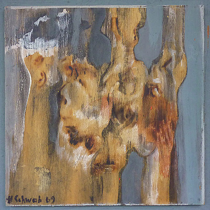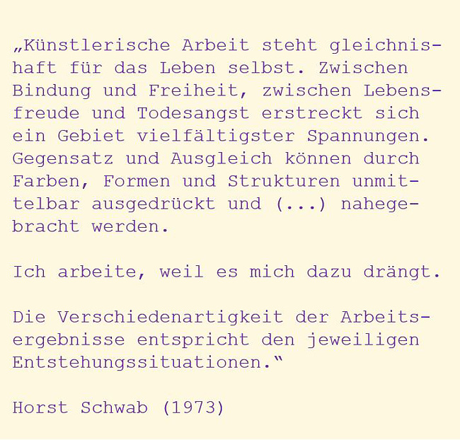 Der experimentelle Charakter seiner Malerei lässt viele Möglichkeiten offen. Schwab (...) geht nicht mit fertigem Konzept an die Arbeit heran. Ein fest vorgenommenes Ziel würde ihn vor Entdeckungen und Überraschungen, auch vor Entscheidungen, die sich während des Malens einstellen, ablenken. Der kreative Instinkt (...) leitet ihn, - nicht dass er alles dem Zufall überließe. (...). Seine Farben sind von "anderer Dichtigkeit" als die atmosphärischen Erscheinungen in der Natur. Dennoch erzeugt er in seinen Bildern Atmosphäre, Weiträumigkeit, Spannung zwischen dunklen und hellen Partien. (...) Schwab hat (...) seine eigene Farbskala, auch die ihm gemäßen Materialien gefunden. (Prof. Wilhelm Weber, Pfalzgalerie Kaiserslautern, 1973)
