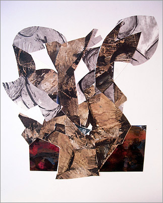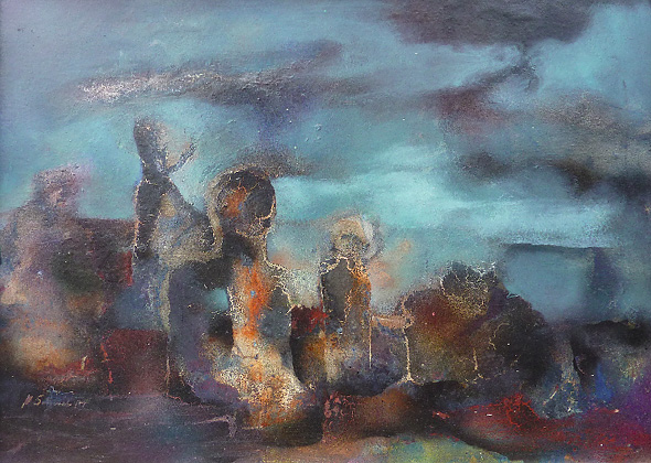 Häufig werden die Wirkungen natürlicher Formen und Vorgänge durch in symbolhafte Zeichen verwandelte abstrakte Elemente ergänzt [...] und die Collagen ermöglichen es ihm, gleichzeitig mehrere Bedeutungsebenen zum Ausdruck zu bringen... (Kostyál Lászlo, 1992)
